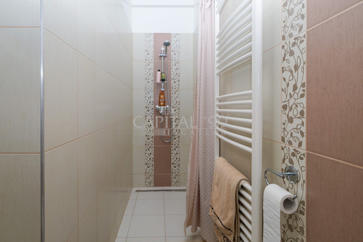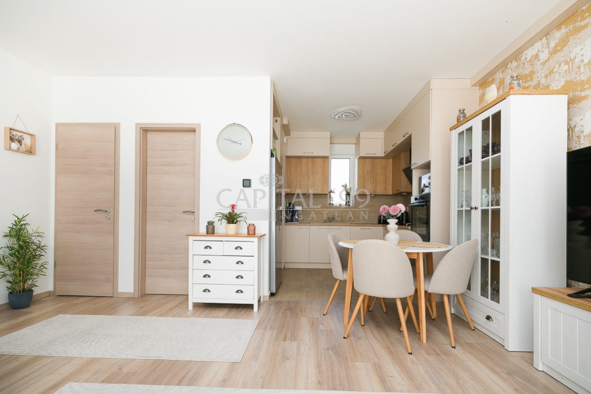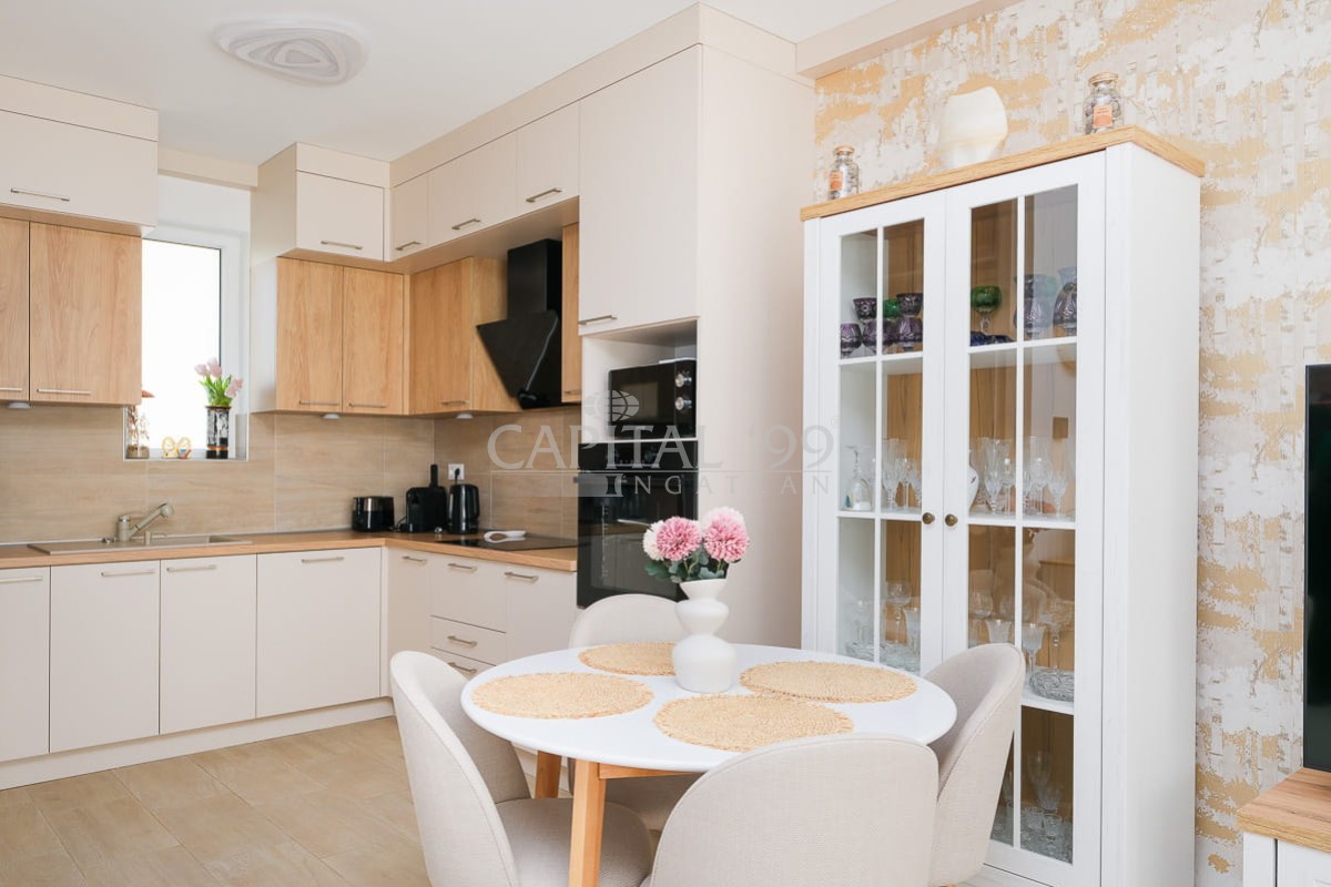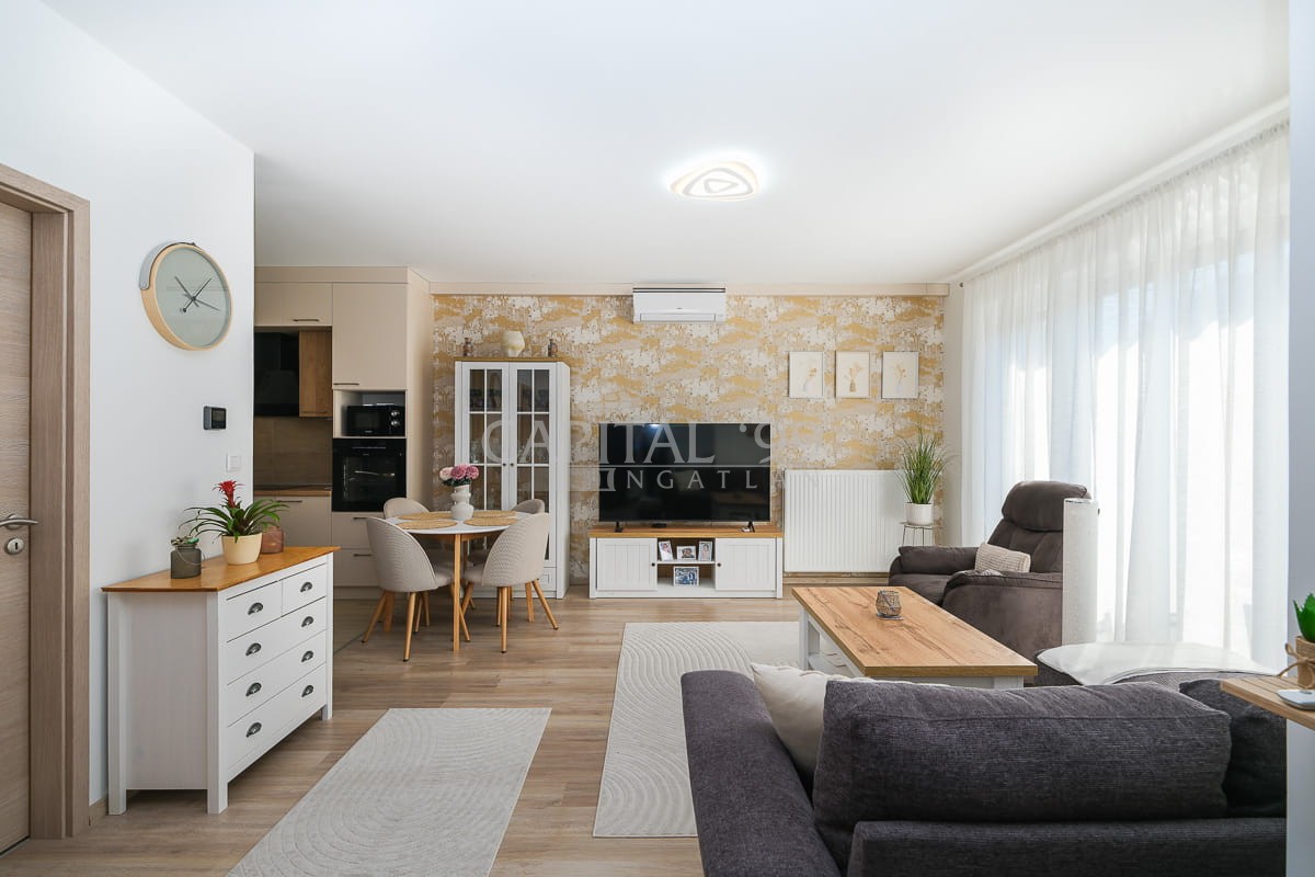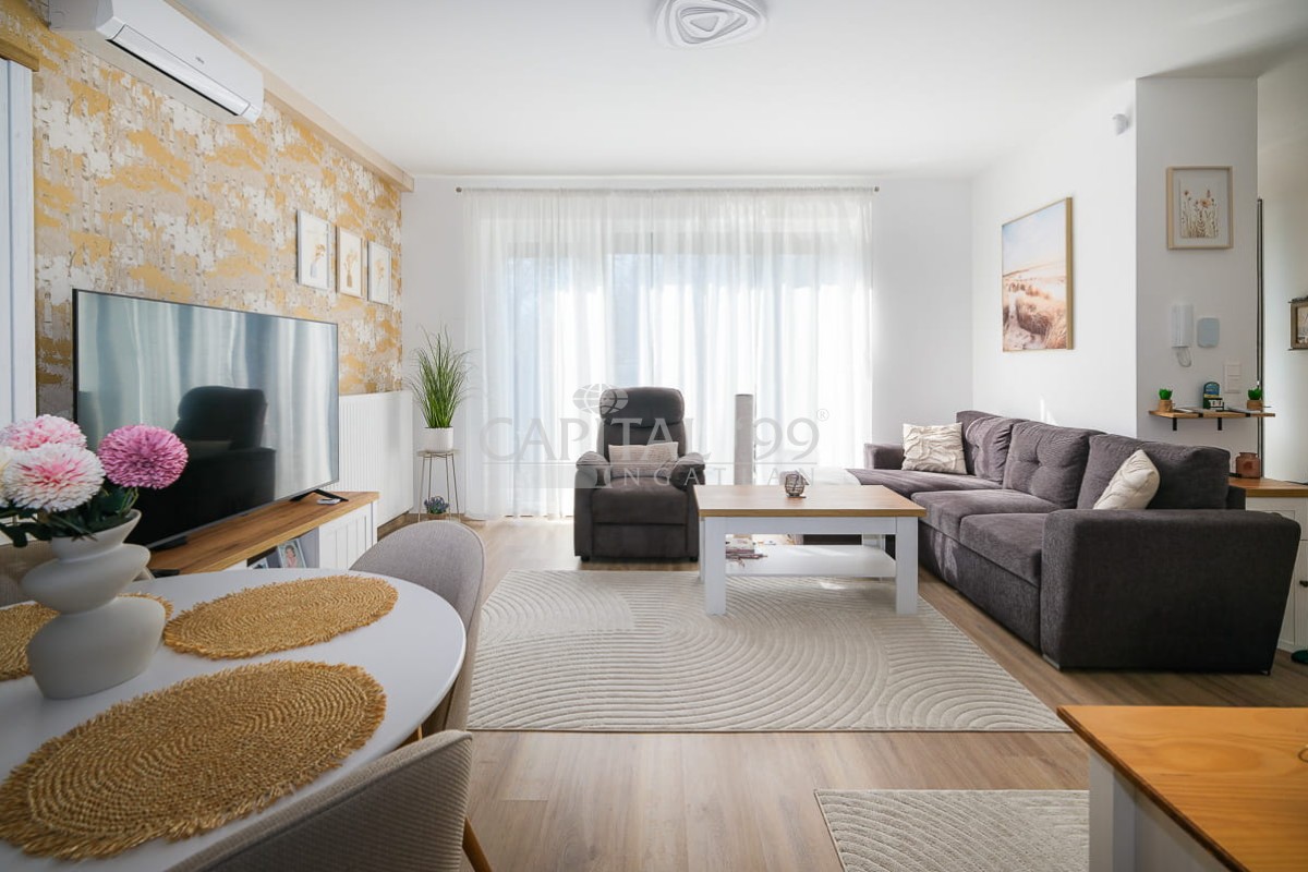 Die inneren lichterfüllten, weitläufigen Räumlichkeiten der Wohnung sind von praktischer Gestaltung geprägt. Das Wohnzimmer hat ein direkter Ausgang zur Terrasse, so ist es reich an natürliches Licht, die eine gemütliche Atmosphäre bietet. Die Küche ist modern ausgestaltet, und kommt mit Einbaugeräten von hoher Qualität.