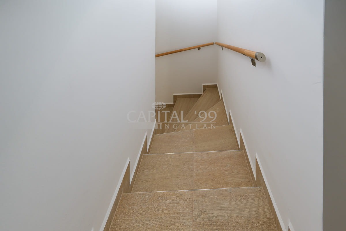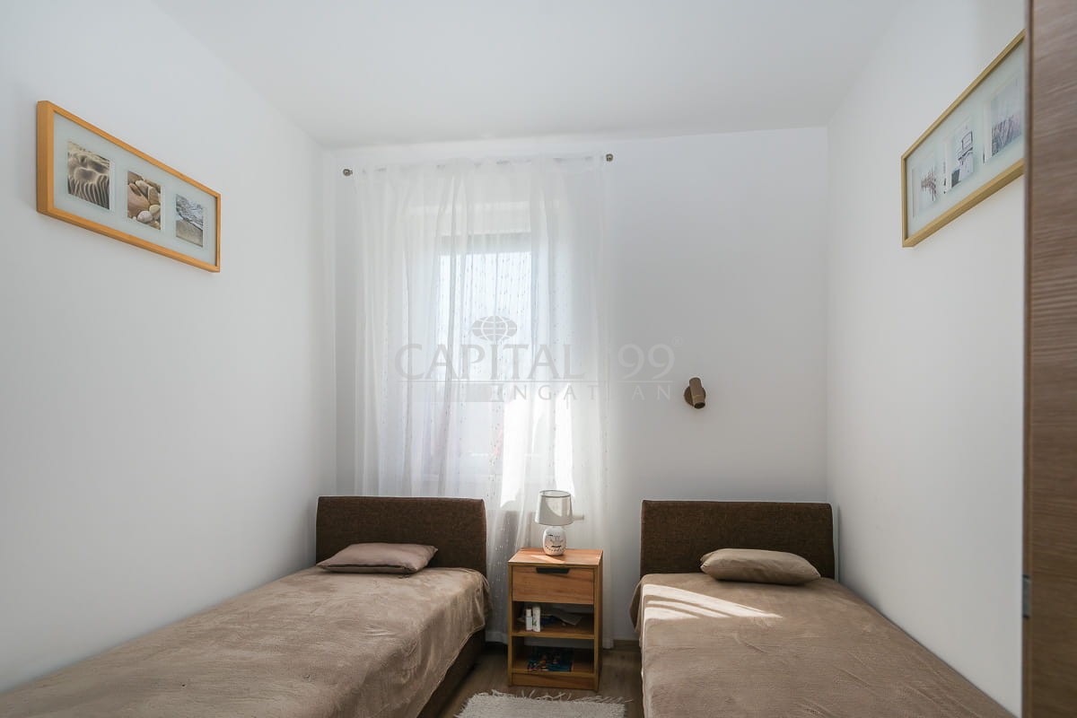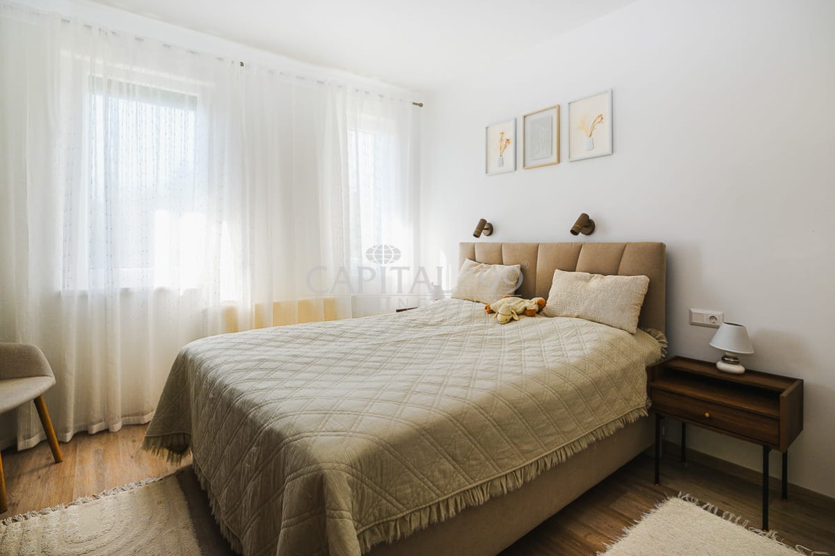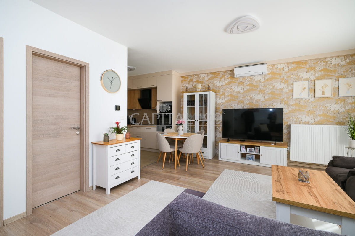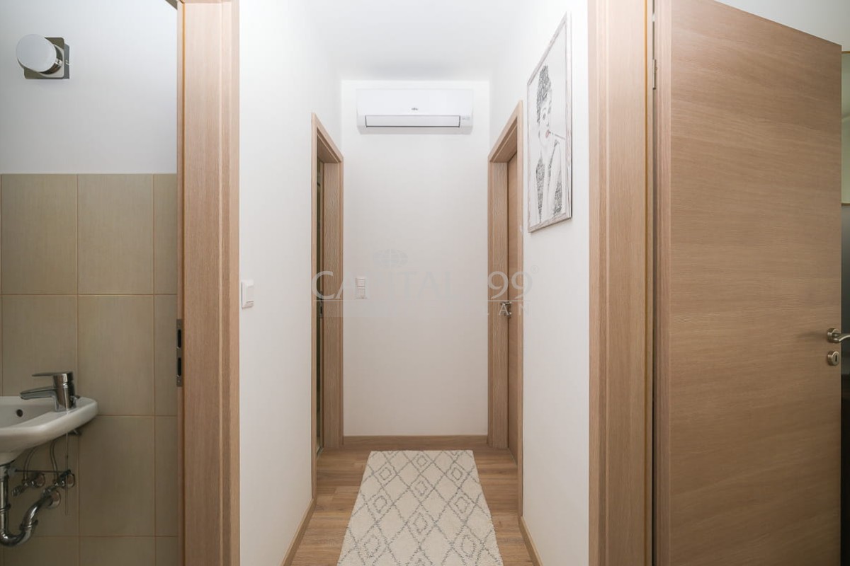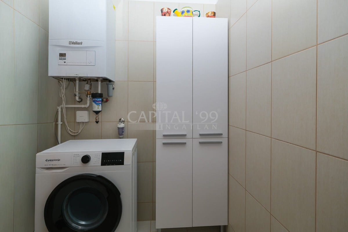 Die inneren lichterfüllten, weitläufigen Räumlichkeiten der Wohnung sind von praktischer Gestaltung geprägt. Das Wohnzimmer hat ein direkter Ausgang zur Terrasse, so ist es reich an natürliches Licht, die eine gemütliche Atmosphäre bietet. Die Küche ist modern ausgestaltet, und kommt mit Einbaugeräten von hoher Qualität.